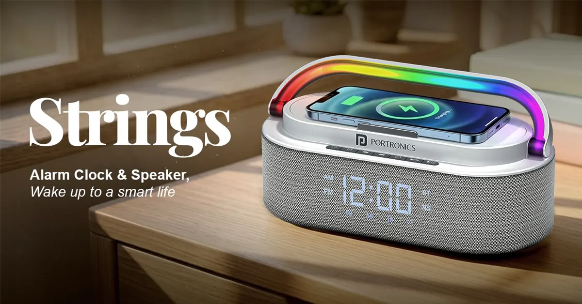 The new Portronics Strings is a 3-in-1 bedside companion that combines 16W sound, 15W wireless charging, an alarm clock, and RGB ambient lighting in one compact device, priced at Rs 2,249.